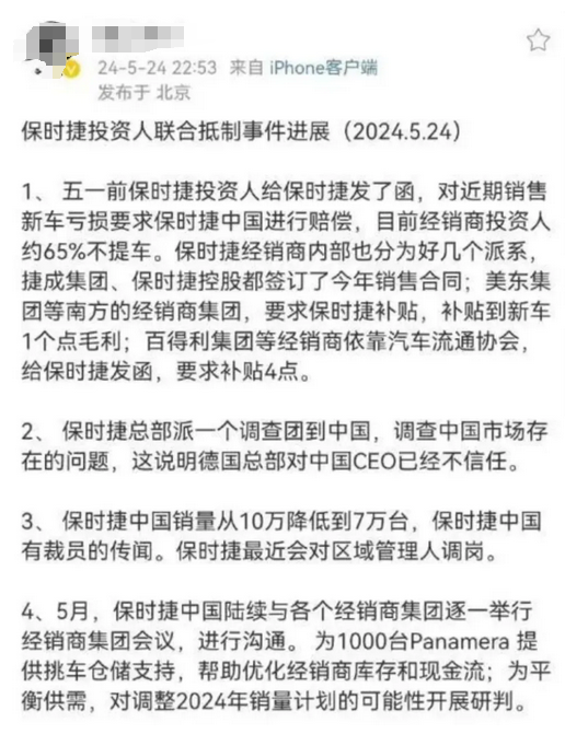2024年5月底,出现保时捷经销商集体“逼宫主机厂”事件。