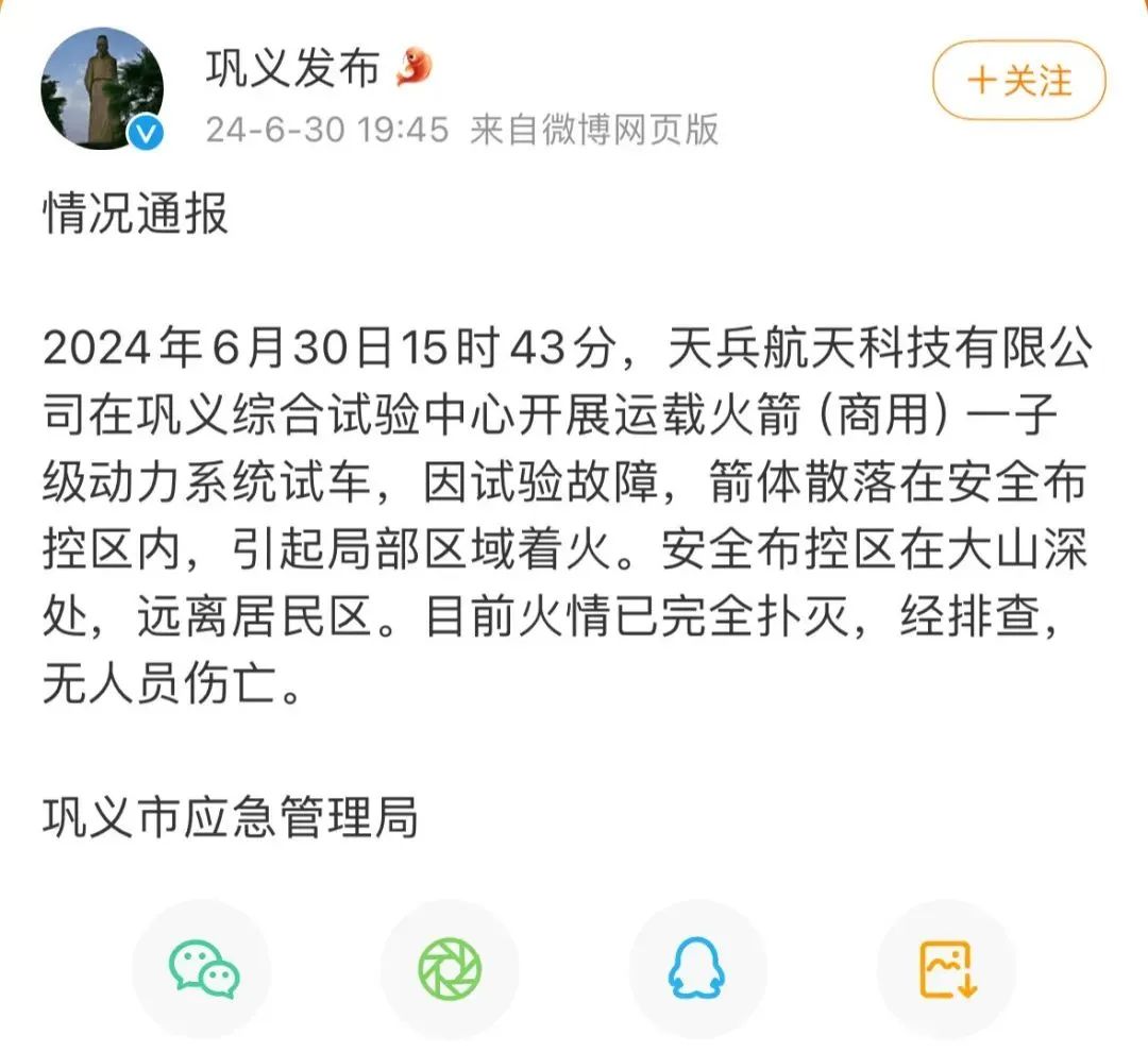 据@巩义发布消息,2024年6月30日15时43分,天兵航天科技有限公司在巩义综合试验中心开展运载火箭(商用)一子级动力系统试车,因试验故障,箭体散落在安全布控区内,引起局部区域着火。安全布控区在大山深处,远离居民区。目前火情已完全扑灭,经排查,无人员伤亡。