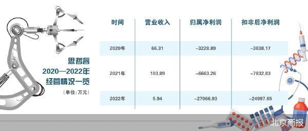 财务数据显示,2020—2022年,思哲睿实现的营业收入分别约为66.31万元、103.89万元、5.94万元,尚未实现稳定的营收;对应实现的归属净利润分别约为-0.32亿元、-0.67亿元、-2.71亿元,亏损逐年加剧。此外,公司预计2023年上半年净利约为-2.1亿至-1.75亿元,同比大幅增亏。