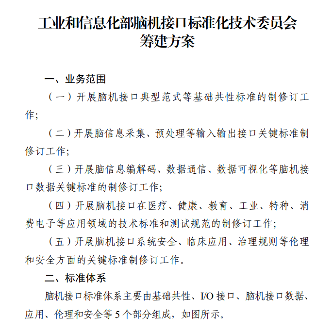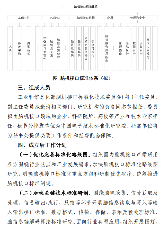 工业和信息化部脑机接口标准化技术委员会筹建方案公示,其中提到,工业和信息化部脑机接口标准化技术委员会(筹)主任委员、副主任委员拟邀请相关部门、研究机构的负责同志等担任,委员拟由脑机接口领域的企业、科研院所、高校等产业和技术专家担任,秘书处挂靠单位为中国电子技术标准化研究院。挂靠单位将为秘书处提供必要工作条件和经费配套保障。成立后工作计划包括:优化完善标准化路线图、加快关键技术标准研制、推动标准宣贯实施。