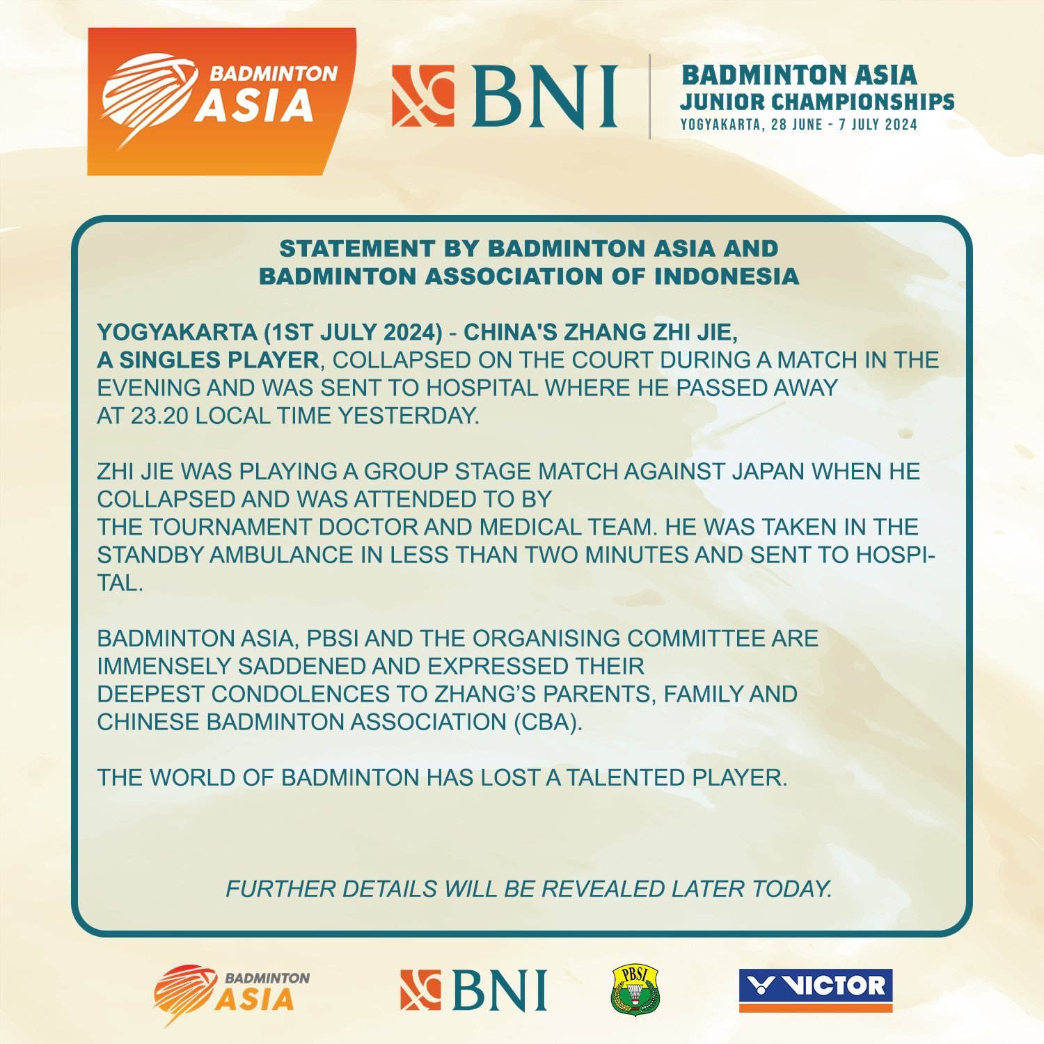 亚洲羽毛球协会、印尼羽毛球协会和组委会对此深表悲痛,并向张志杰的父母、家人和中国羽毛球协会表示最深切的慰问。世界羽坛失去了一位天才选手。