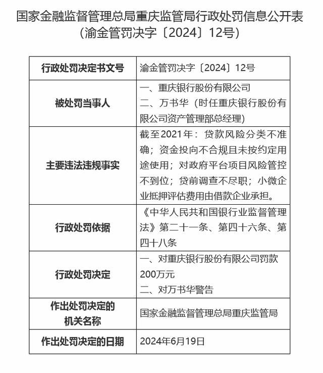 国家金融监管总局网站28日披露的行政处罚信息公开表显示,重庆银行贷款风险分类不准确等被罚款200万元。时任重庆银行股份有限公司资产管理部总经理的万书华也被国家金融监督管理总局重庆监管局警告。