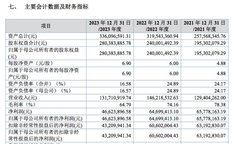 招股书指出,2023年,生物医药行业融资环境疲软,行业融资紧缩。以创新为驱动的生物医药产业高度依赖资金支持,从而影响公司客户研发项目推进。公司为了强化市场竞争力、巩固市场份额、提高客户服务水平,对检测服务降价销售。2023年公司检测数量同比上涨,但因价格下调,导致营业收入、产品毛利率同比降低,进而公司业绩同比出现下滑。2023年公司实现营业收入13171万元,同比下降9.92%,扣除非经常性损益后归属于母公司股东的净利润为4321万元,同比下降28.70%。