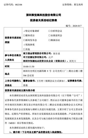 投资者请莱宝高科简要说明一下公司与地方政府合作投资的微腔电子纸显示器件(MED)项目的目的和建成投产后对公司可能带来的主要影响。莱宝高科透露,如公司2023年10月21日发布的公告所述,公司与地方政府合作投资的微腔电子纸显示器件(MED)项目,本次合作投资的目的是公司积极应对生存与发展危机、把握全球中大尺寸彩色电子纸细分蓝海市场发展机遇、保持长远可持续发展。