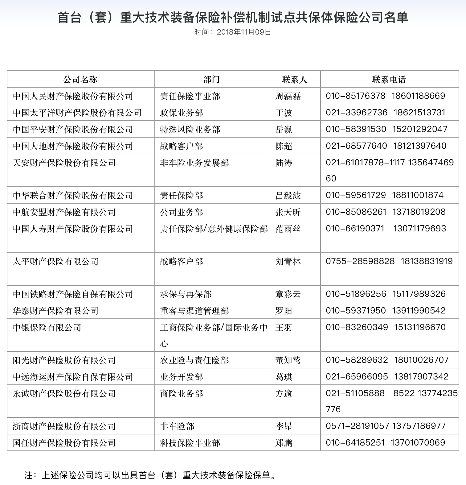 通过查询国家金融监督管理总局网站以及工信部网站,经时代财经记者不完全统计,参与首台(套)重大技术装备保险补偿机制试点共保体的保险公司包括:人保财险、太平洋财险、平安财险、大地保险、天安财险、中华联合财险、中航安盟财险、国寿财险以及太平财险、中国铁路自保、华泰财险、中银保险、阳光财险、中远海运自保、永城财险、浙商财险、国任财险。