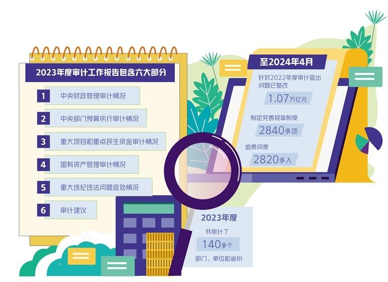 审计署审计长侯凯表示,自2023年5月以来,审计署共发现并移送的重大违纪违法问题线索310多件,涉及1200多人。至2024年4月,针对2022年度审计查出问题已整改1.07万亿元,制定完善规章制度2840多项,追责问责2820多人。
