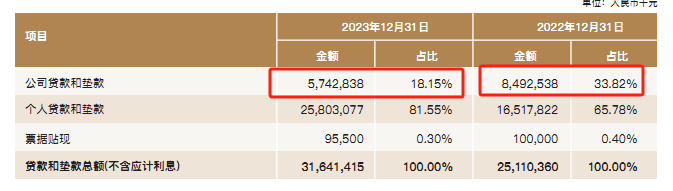 对企业贷款业务的体量,从2022年底的84.92亿元,下降到了2023年底的57.42亿元,降幅达到32.38%;在整体贷款的体量占比也从33.82%下降到了18.15%。