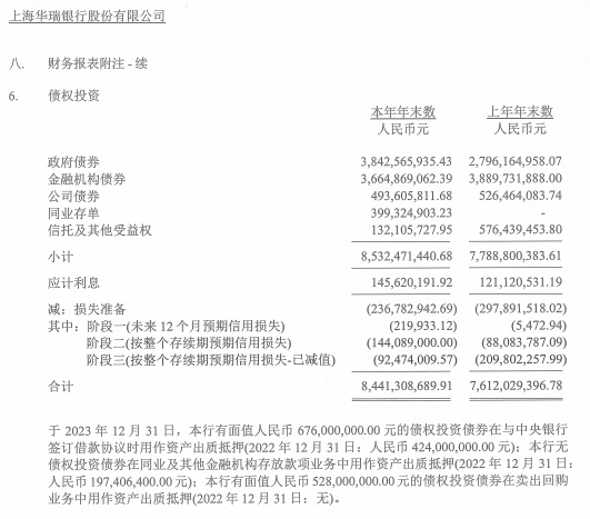 几笔非标踩雷,导致长期追讨本金后,从财报上看,华瑞银行在债权投资这一块,构成结构已趋于保守:2023年底总余额为85.32亿元,其中约75亿是政府债和金融机构债。还有3.99亿是同业存单。信托和其他受益权已从5.76亿元下降到了1.32亿元。