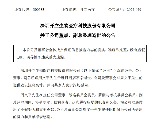 6月27日晚间,开立医疗(300633.SZ)发布公告称,公司董事、副总经理周文平于近日因病不幸逝世。