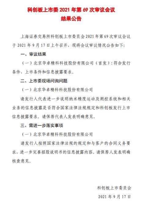 根据上交所披露,2021年9月17日召开的科创板上市委2021年第69次审议会议结果显示,华卓精科首发符合发行条件、上市条件和信息披露要求。