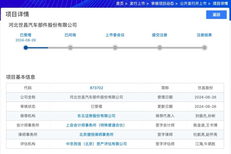 6月26日,北京证券交易所网站公开发行并上市进程显示,新三板挂牌公司河北世昌汽车部件股份有限公司(以下简称“世昌股份”或“公司”)IPO已获北交所受理。