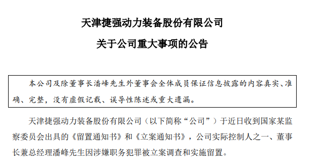 6月26日晚间,A股上市公司捷强装备(300875.SZ)公告,收到国家某监察委员会出具的《留置通知书》和《立案通知书》,公司实际控制人之一、董事长兼总经理潘峰因涉嫌职务犯罪被立案调查和实施留置。
