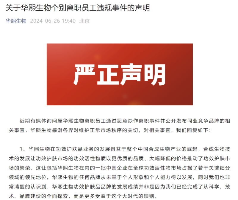 6月26日晚间,华熙生物在官微表示,关注到近期有媒体询问原华熙生物离职员工通过恶意炒作离职事件并公开发布同业竞争品牌的相关事宜。