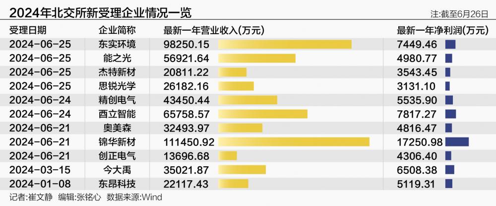 然而,6月21日~6月25日新获受理的9家北交所企业中,2023年净利润最低者亦为3131.10万元;7家净利润在4500万元以上;东实环境(7449.46万元)与酉立智能(7817.27万元)2023年净利润接近8000万元。8000万元曾为主板上市基准线,4月12日IPO新规门槛提升之后创业板上市门槛亦仅为6000万元。