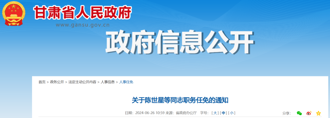 陈世星任甘肃省人民政府副秘书长,免去其甘肃省人民政府办公厅副主任、甘肃省数据局副局长(兼)职务;