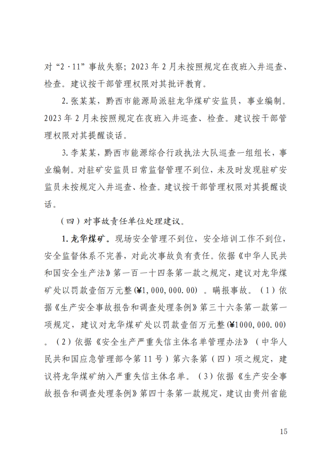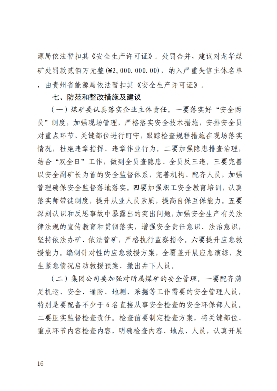 依据《安全生产严重失信主体名单管理办法》,建议将龙华煤矿纳入严重失信主体名单。依据《生产安全事故报告和调查处理条例》第四十条第一款规定,建议由贵州省能源局依法暂扣其《安全生产许可证》。