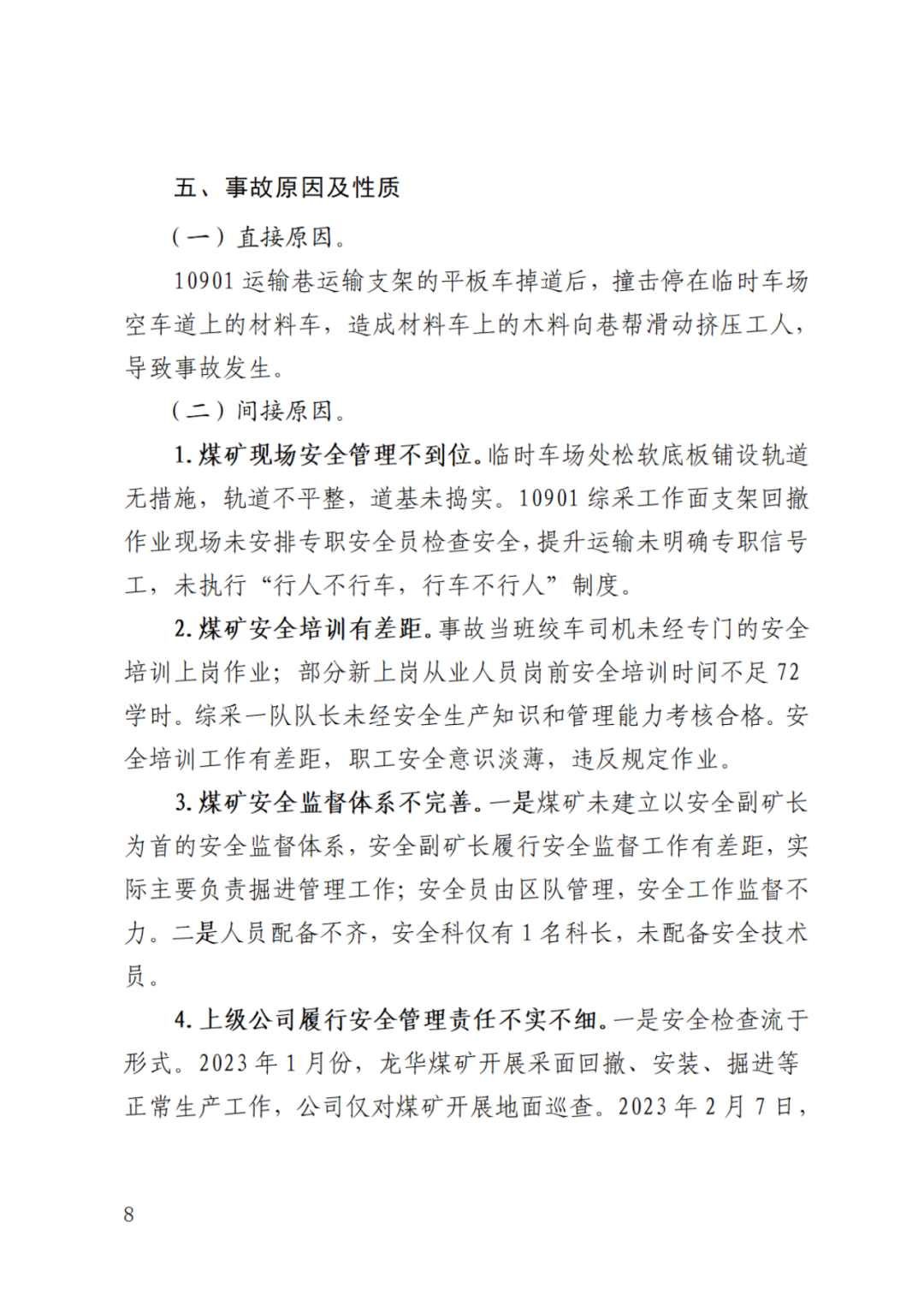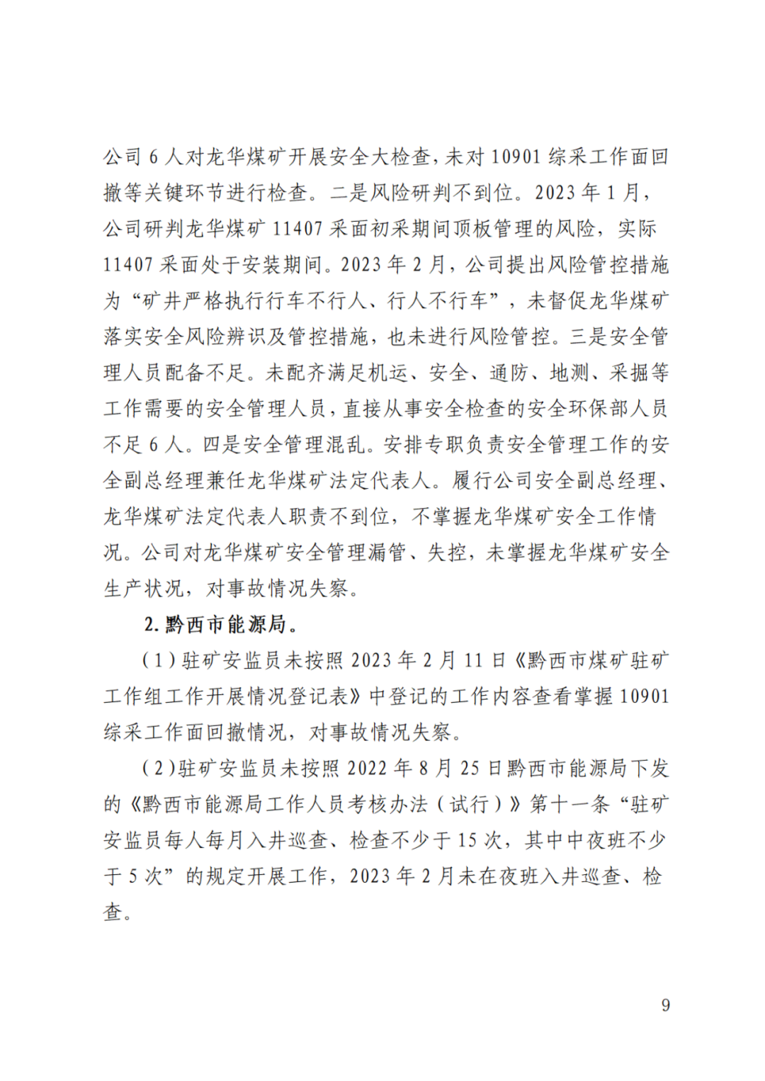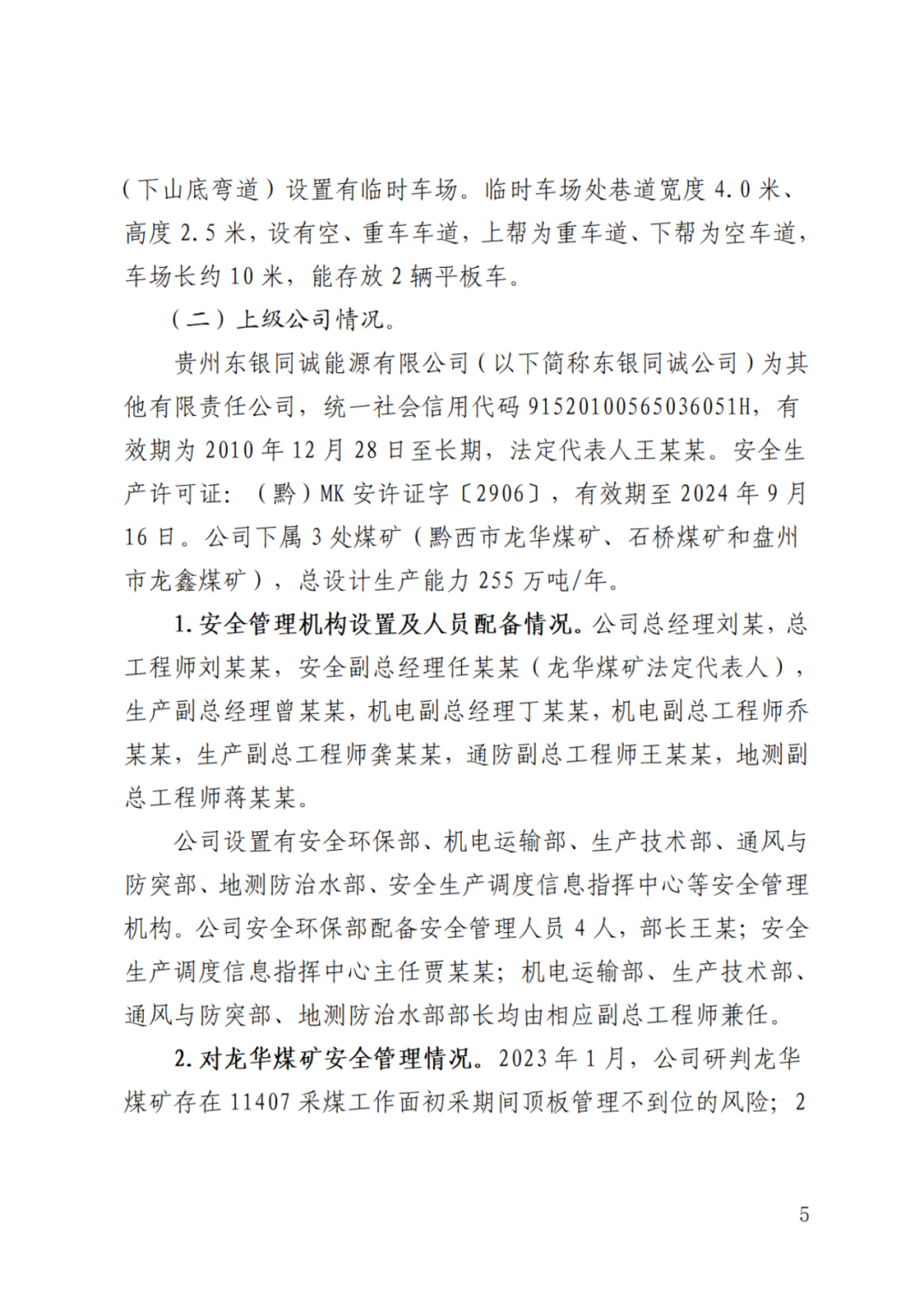 4.上级公司(贵州东银同诚能源有限公司)履行安全管理责任不实不细。一是安全检查流于形式。2023年1月份,龙华煤矿开展采面回撤、安装、掘进等正常生产工作,公司仅对煤矿开展地面巡查。2023年2月7日,公司6人对龙华煤矿开展安全大检查,未对10901综采工作面回撤等关键环节进行检查。二是风险研判不到位。2023年2月,公司提出风险管控措施为“矿井严格执行行车不行人、行人不行车”,未督促龙华煤矿落实安全风险辨识及管控措施,也未进行风险管控。三是安全管理人员配备不足。未配齐满足机运、安全、通防、地测、采掘等工作需要的安全管理人员,直接从事安全检查的安全环保部人员不足6人。四是安全管理混乱。安排专职负责安全管理工作的安全副总经理兼任龙华煤矿法定代表人。履行公司安全副总经理、龙华煤矿法定代表人职责不到位,不掌握龙华煤矿安全工作情况。公司对龙华煤矿安全管理漏管、失控,未掌握龙华煤矿安全生产状况,对事故情况失察。