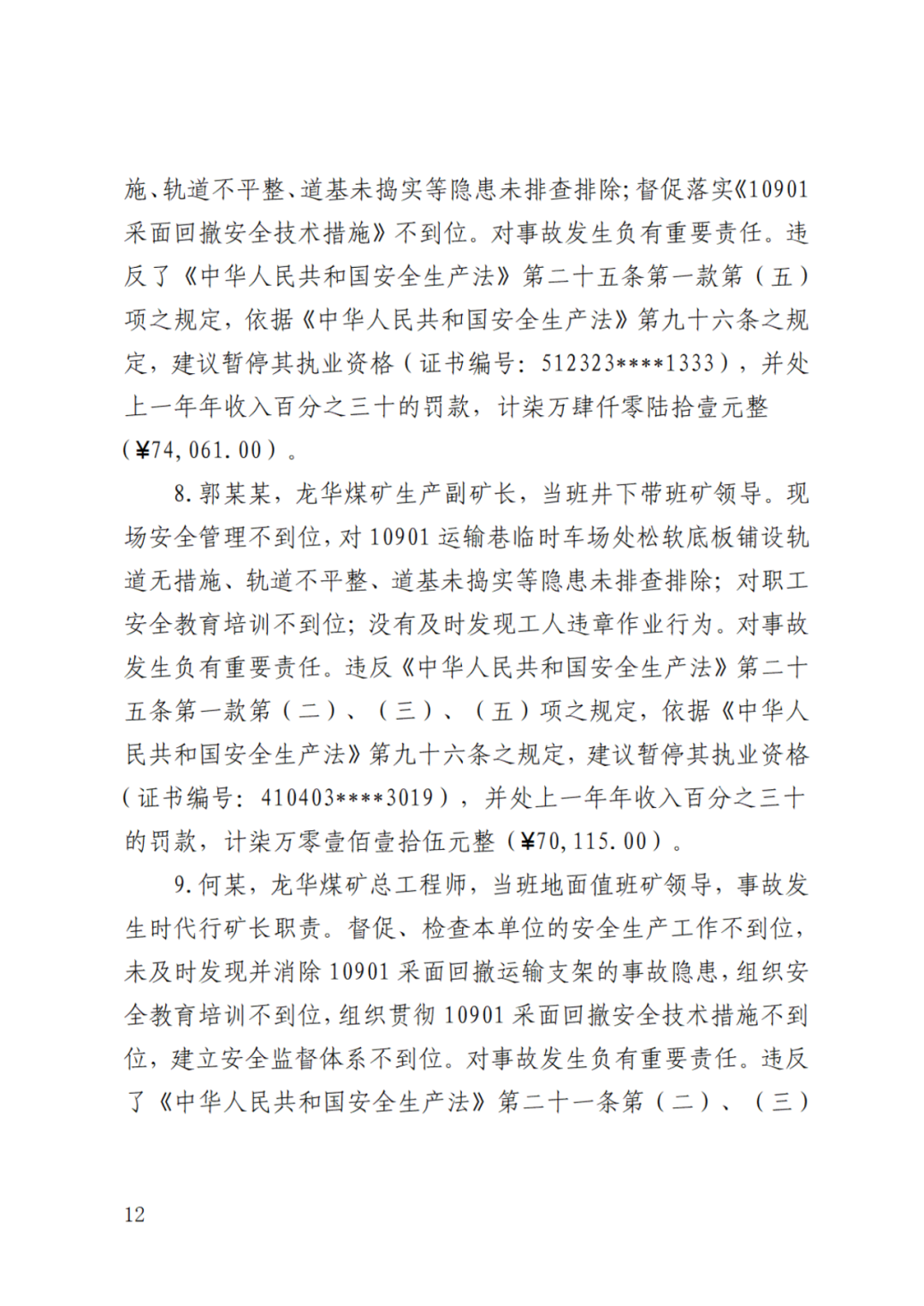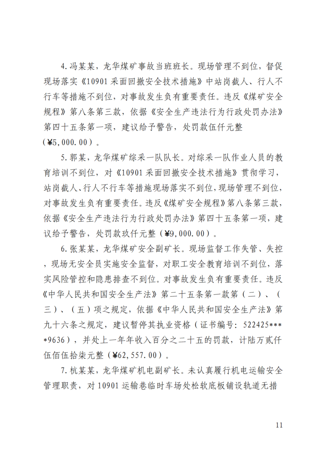 事故调查报告写明,龙华煤矿现场安全管理不到位,安全培训工作不到位,安全监督体系不完善,对此次事故负有责任。依据《中华人民共和国安全生产法》第一百一十四条第一款之规定,建议对龙华煤矿处以罚款壹佰万元整(¥1,000,000.00)。