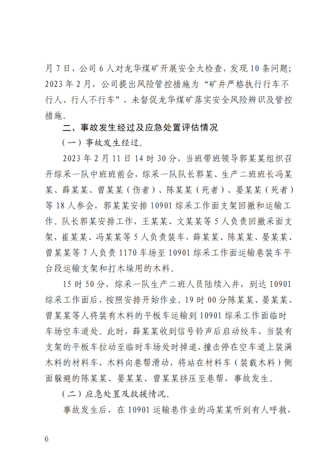 2023年2月11日14时30分,龙华煤矿当班带班领导郭某某安排10901综采工作面支架回撤和运输工作。队长郭某安排工作,王某某、文某某等5人负责回撤采面支架,崔某某、冯某某等5人负责装车,薛某某、陈某某、晏某某、曾某某等7人负责1170车场至10901综采工作面运输巷装车平台段运输支架和打木垛用的木料。15时50分,综采一队生产二班人员陆续入井,到达10901综采工作面后,按照安排开始作业。19时陈某某、晏某某、曾某某等人将装有木料的平板车运输到10901综采工作面临时车场空车道处。此时,薛某某收到信号铃声后启动绞车,当装有支架的平板车拉动至临时车场处时掉道,撞击停在空车道上装满木料的材料车,木料向巷帮滑动,将站在材料车(装载木料)侧面躲避的陈某某、晏某某、曾某某挤压至巷帮,事故发生。事故导致陈某某、晏某某死亡,曾某某受伤。
