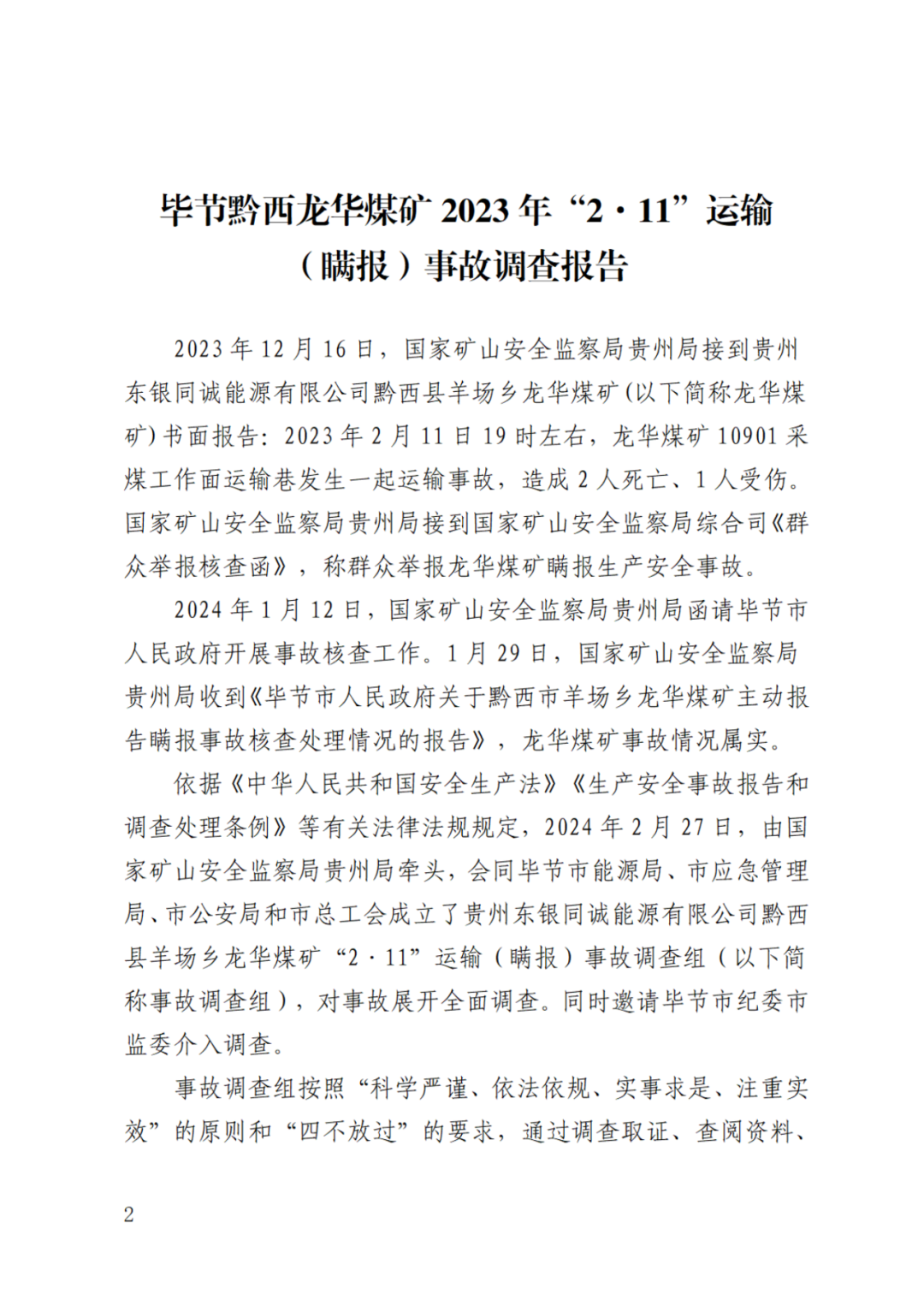 事发10个月后,2023年12月16日,龙华煤矿才向国家矿山安全监察局贵州局、黔西市人民政府书面报告了事故情况。调查报告披露,国家矿山安全监察局贵州局曾接到国家矿山安全监察局综合司《群众举报核查函》,有群众对龙华煤矿瞒报生产安全事故进行过举报。2024年1月12日,国家矿山安全监察局贵州局函请毕节市人民政府开展事故核查工作。1月29日,国家矿山安全监察局贵州局收到《毕节市人民政府关于黔西市羊场乡龙华煤矿主动报告瞒报事故核查处理情况的报告》,龙华煤矿事故情况属实。2月27日,由国家矿山安全监察局贵州局牵头,会同毕节市能源局、市应急管理局、市公安局和市总工会成立了贵州东银同诚能源有限公司黔西县羊场乡龙华煤矿“2·11”运输(瞒报)事故调查组,对事故展开了全面调查。