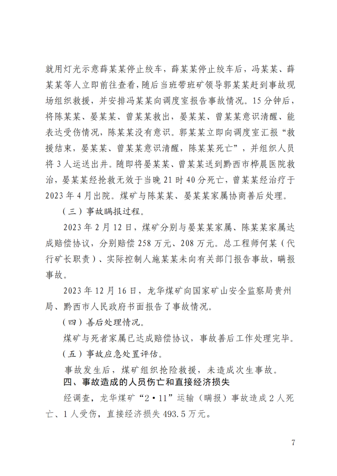 2023年2月12日,龙华煤矿分别与晏某某家属、陈某某家属达成赔偿协议,分别赔偿258万元、208万元。总工程师何某(代行矿长职责)、实际控制人施某某未向有关部门报告事故,瞒报事故。