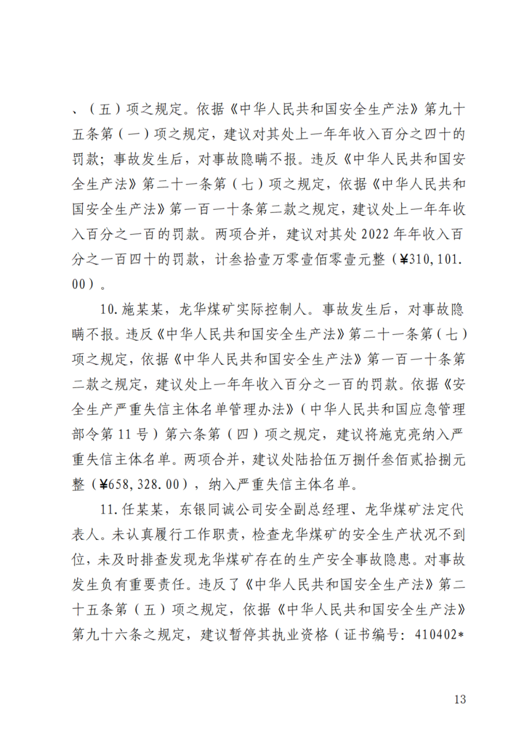 另外,龙华煤矿瞒报事故。依据《生产安全事故报告和调查处理条例》第三十六条第一款第一项规定,建议对龙华煤矿处以罚款壹佰万元整(¥1000,000.00)。