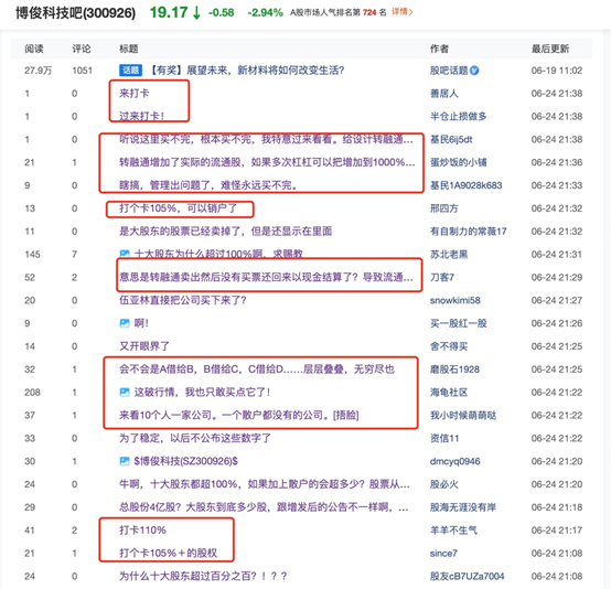 6月24日,一则“博俊科技前十大流通股东持股合计占比105.75%,股东可能通过转融通出借业务将限售股违规卖出。”消息发酵。