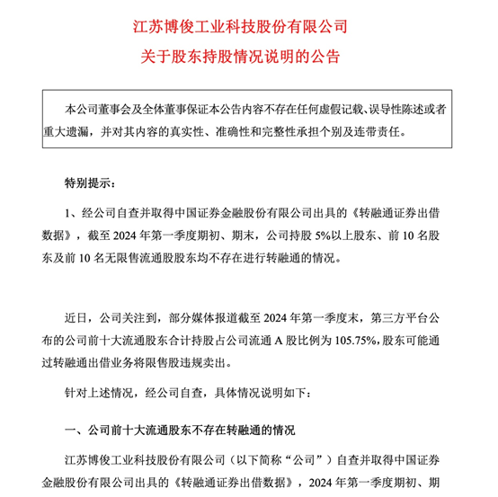 6月24日晚,博俊科技发布《关于股东持股情况说明的公告》进行辟谣:公司前十大流通股东不存在转融通情况,出现105.75%的原因为披露口径差异所致。