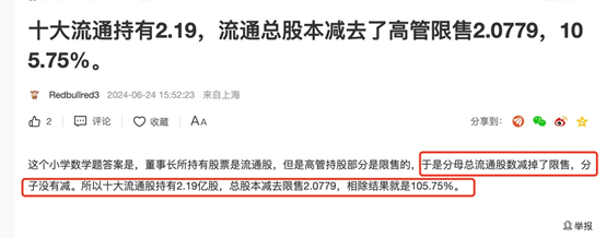 事实上,在贴吧也有网友给出“统计口径错误”的答案。有网友表示,“董事长持有的是流通股,部分高管持有的是限售股,分母中总流通股数减掉了限售,但是分子中并没有减,所以十大流通股持有2.19亿股,总股本减去限售股,相除结果为105.75%。”