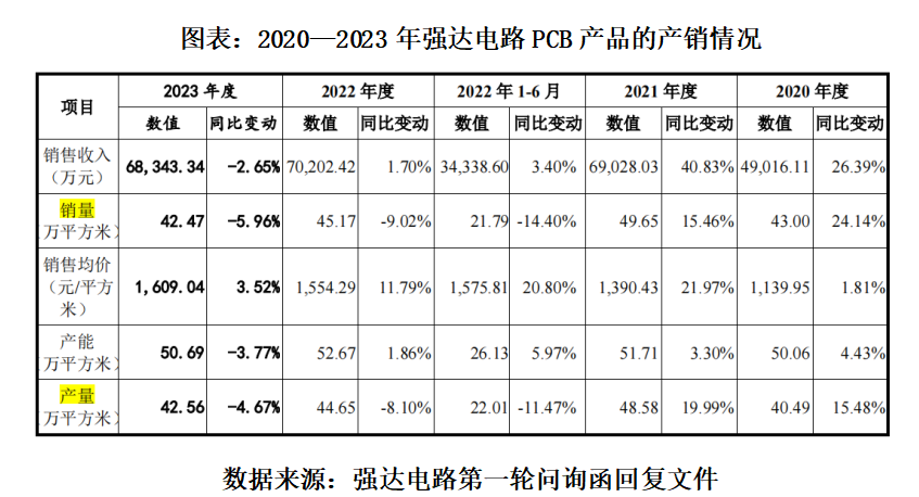 第一轮问询函回复文件显示,2021—2023年,强达电路的产能分别为50.06万平方米、51.70万平方米、50.69万平方米,销量分别为49.65万平方米、45.17万平方米、42.47万平方米。