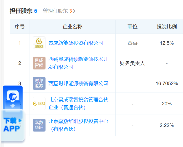 此外,景成新能源、西藏财邦能源也存在关联。天眼查显示,两家公司的股东均有胡明阳,其在前者持股12.5%,在后者持股16.71%。
