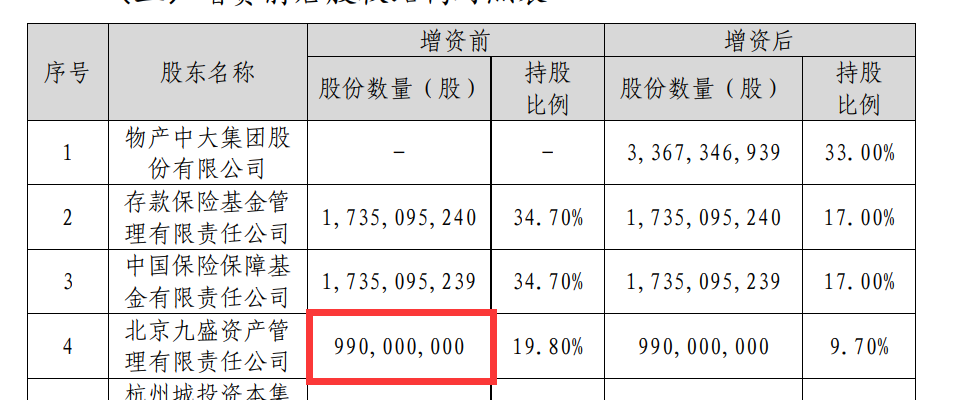 该增资方案在今年1月获得批准,增资后,物产中大将成为信泰人寿的第一大股东,持股33%;存款保险基金和保险保障基金均持股17%,并列第二大股东;九盛资产持股比例则被稀释至9.7%,为第四大股东;杭州城投、萧山国际、钱江世纪城分别持股9%、5.6%、3.4%。4家浙江国企合计持股比例将达到51%。