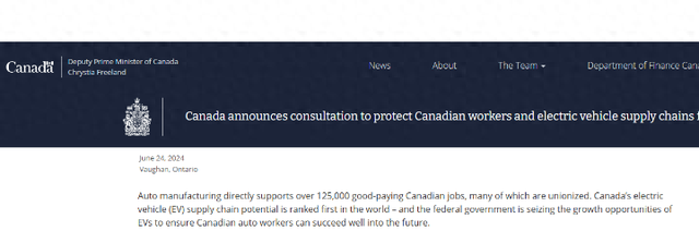 财联社6月25日电,加拿大副总理兼财政部长Chrystia Freeland当地时间周一宣布,将从7月2日开始,启动为期30天的公众咨询期,讨论针对中国电动汽车进口的一系列拟议措施。Freeland提到了欧盟和美国最近采取的举措,并表示加方拟采取措施可能包括对进口商品征收关税。但她没有详细说明加拿大可能采取的行动是什么,也没有说明电动汽车组件(如电池)是否也可能成为目标。中国外交部发言人曾多次表示,中方一贯反对违反世贸规则单方面加征关税,将采取一切必要措施维护自身正当权益。
