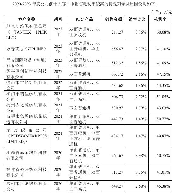 招股书显示,2020年至2023年,佰源装备主营业务毛利率分别为37.37%、35.09%、34.59%、34.93%;其中,对于主要客户坦克斯纺织有限公司(TANTEX IPLIK LLC)、绍兴厚创新材料科技有限公司、常州市恒纶纺织有限公司的销售毛利率分别为60%、47.15%、45.38%。而可比公司毛利率的平均水平约25%,可见佰源装备毛利率水平高于同行业可比公司约10个百分点。