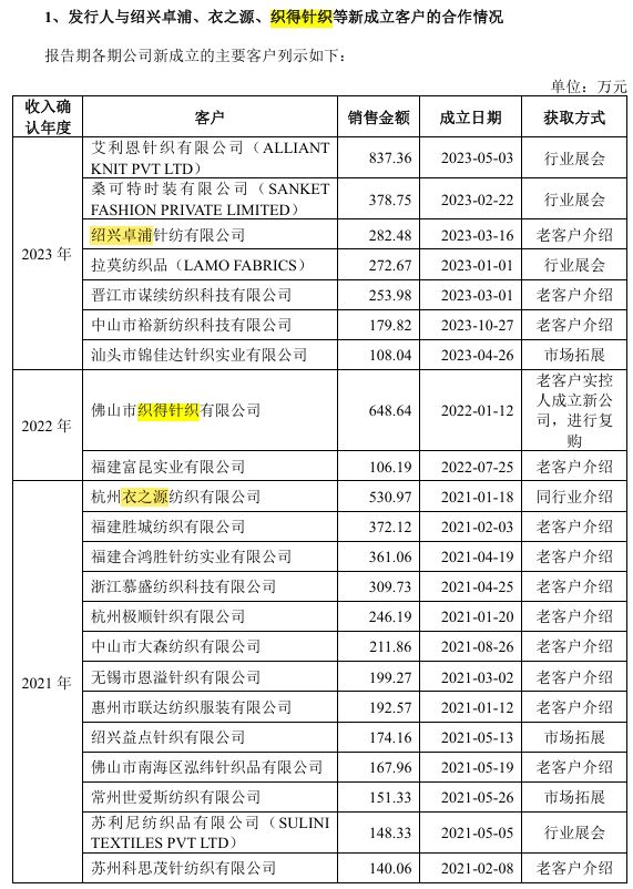 关于织得针织的合作问题,北交所在第二轮问询中要求佰源装备解释其商业合作的合理性。第二轮问询回复中,佰源装备表示,织得针织该客户的合作获取方式为老客户实控人成立新公司,进行复购。这一解释略显苍白。