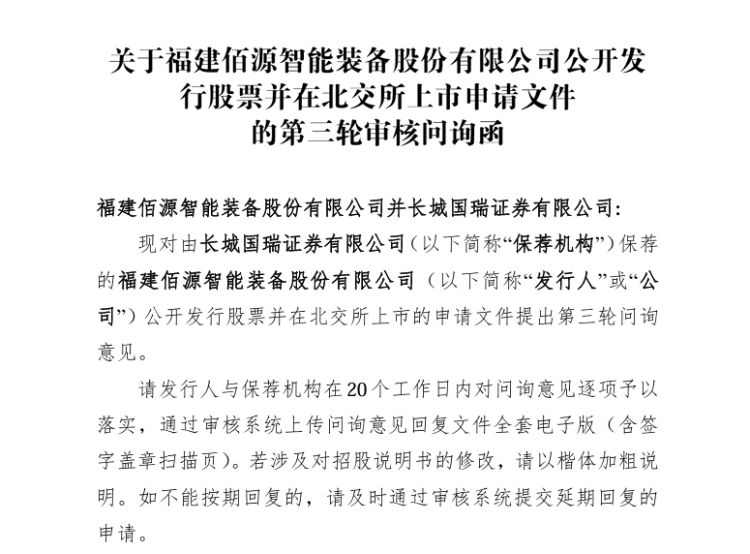 6月20日,北交所更新了佰源装备的IPO最新进展,向佰源装备发出了第三轮审核问询函。本次问询函涉及的问题涉及与新成立客户、小规模客户合作的真实性、毛利率大幅高于同行业可比公司的合理性、经营业绩变动趋势与可比公司不一致的合理性等。