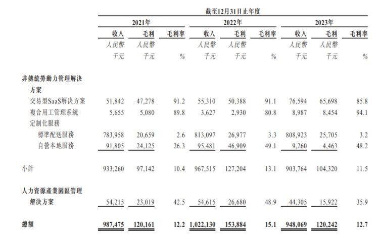 2021-2023年,博尔捷来自非传统劳动力管理解决方案的收入分别为9.33亿元、9.67亿元及9.03亿元,分别占总收入的94.5%、94.7%及95.3%,是公司主要收入来源。同时期内,博尔捷通过人力资源产业园区管理解决方案所得的收入分别为5420万元、5460万元及4430万元,分别占总收入的5.5%、5.3%及4.7%,占比逐年下滑。