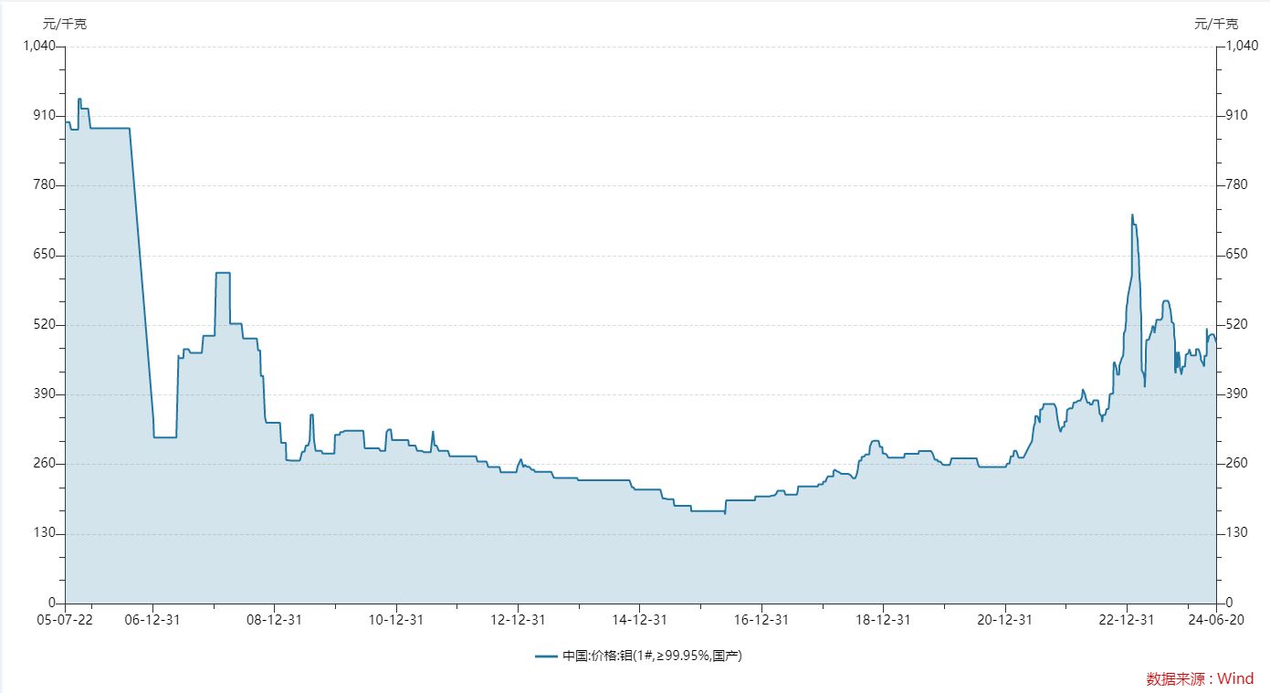 2005年7月至今的中国钼价走势图。图片来源:Wind