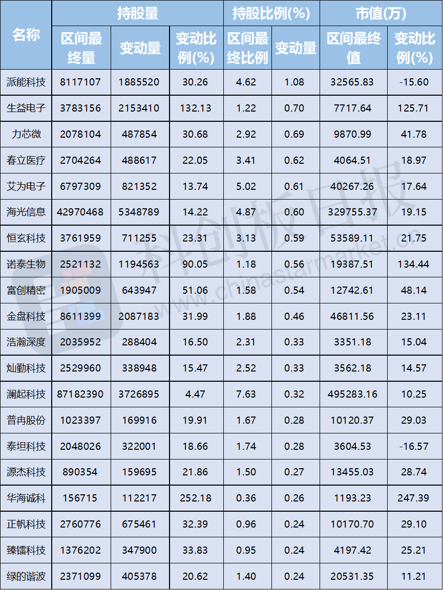 据《科创板日报》统计,按持股比例变动量来看,Top 20中,六成(12家)为半导体公司,分别是力芯微、艾为电子、海光信息、恒玄科技、富创精密、灿勤科技、澜起科技、普冉股份、源杰科技、华海诚科、正帆科技、臻镭科技;其中华海诚科的持股量变动比例最大,超2.5倍,持股量变动比例超30%的9家公司中半导体公司有5家,华海诚科外还包括富创精密、臻镭科技、正帆科技、力芯微。