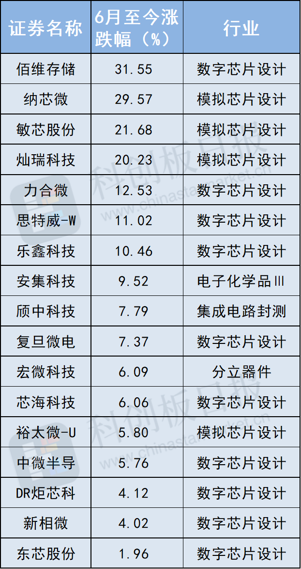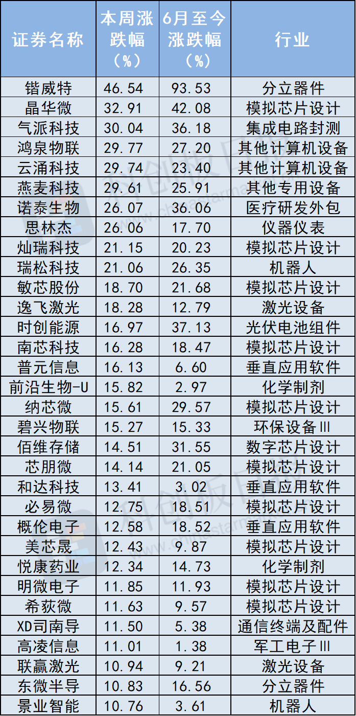 从一周涨幅上看,32家科创板公司累计涨超10%,超四成(14家)为半导体公司,“头三名”也花落半导体板块——分立器件供应商锴威特、模拟芯片设计公司晶华微、集成电路封测公司气派科技均涨超30%,其中,锴威特本月至今累计涨超90%。