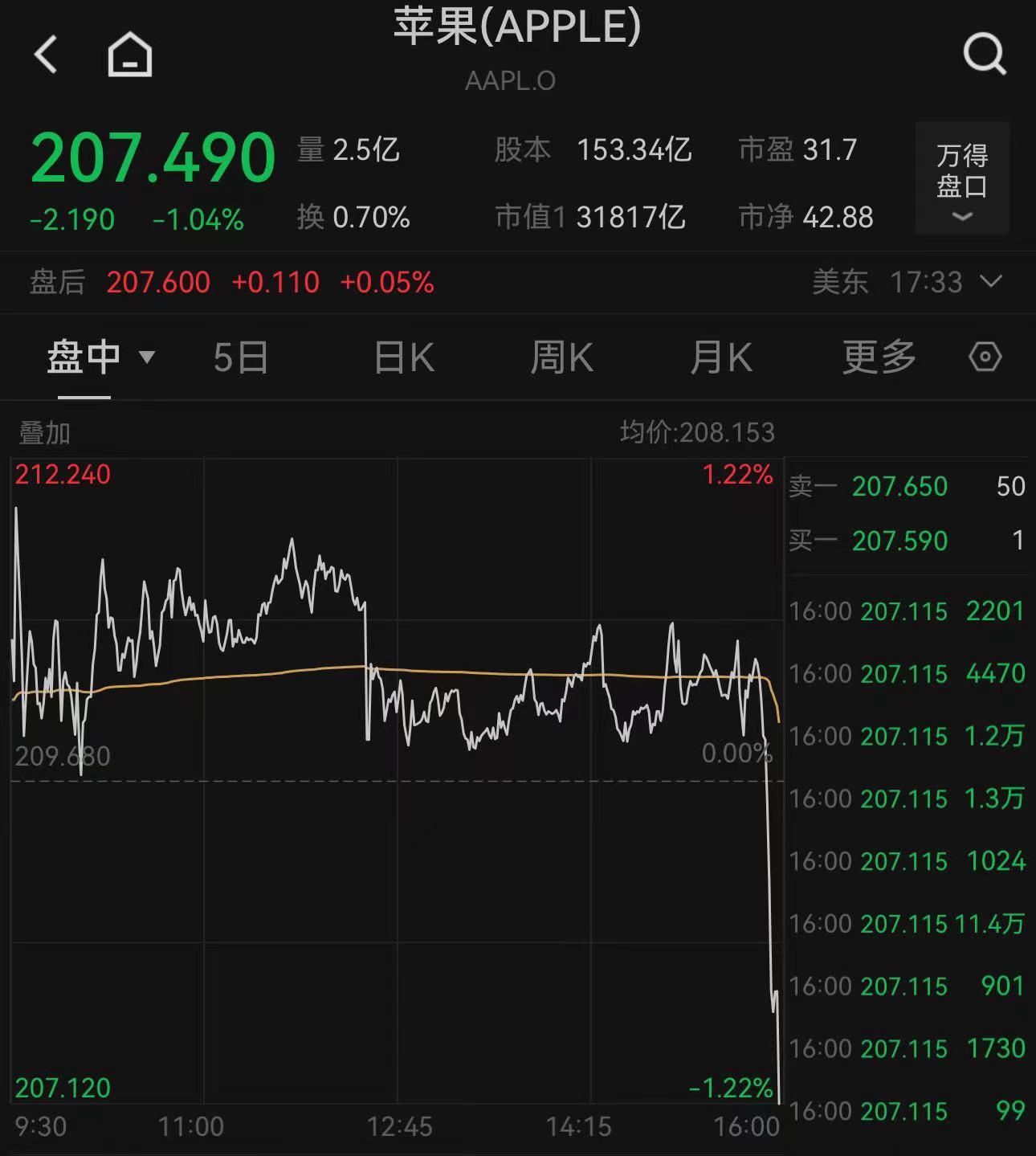 所以苹果尾盘走势出现了显著跳水的走势。
