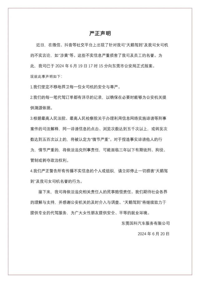 4.我们严正警告所有传播不实信息的个人或组织,请立即停止一切损害“天鹅驾到"及我司女司机名誉的行为。