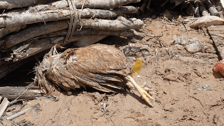 6月19日,记者在村中走访看到,水灾破坏痕迹最重的是湍溪村中心的街道。因地势较低,淤泥、垃圾、破损的家具和禽类尸体堆满街道中央,杂物堆积高度过腰,只能手脚并用通过。在连日超过30度的高温中,杂物散发出类似于发酵物的异味。有村民表示,他们从17日开始日以继夜用铁铲清挖家中淤泥。