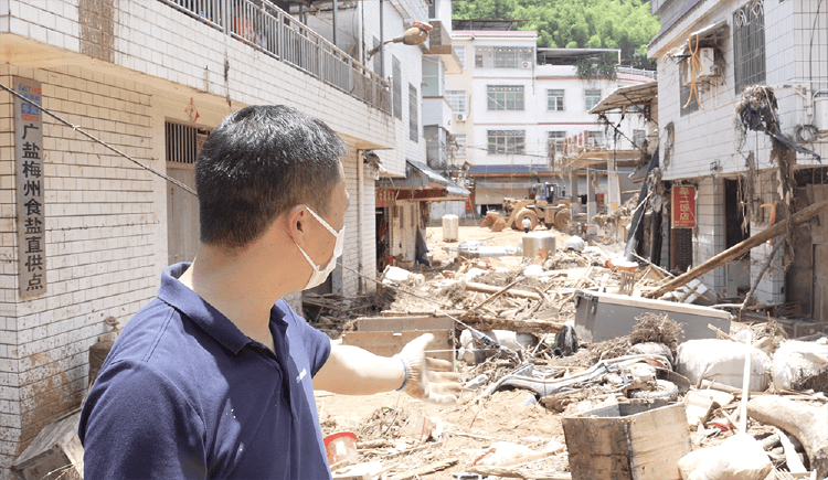 该街道横跨广东和福建两省,北侧尽头是福建省武平县下坝村,南侧属于广东省湍溪村,是一处“跨省街道”。谢力的饭店就位于街道南侧,邻村的福建村民经常过来光顾。他店里还有6万多元下坝村村民的赊账账单,可惜被水冲走,他不确定能追回来多少。