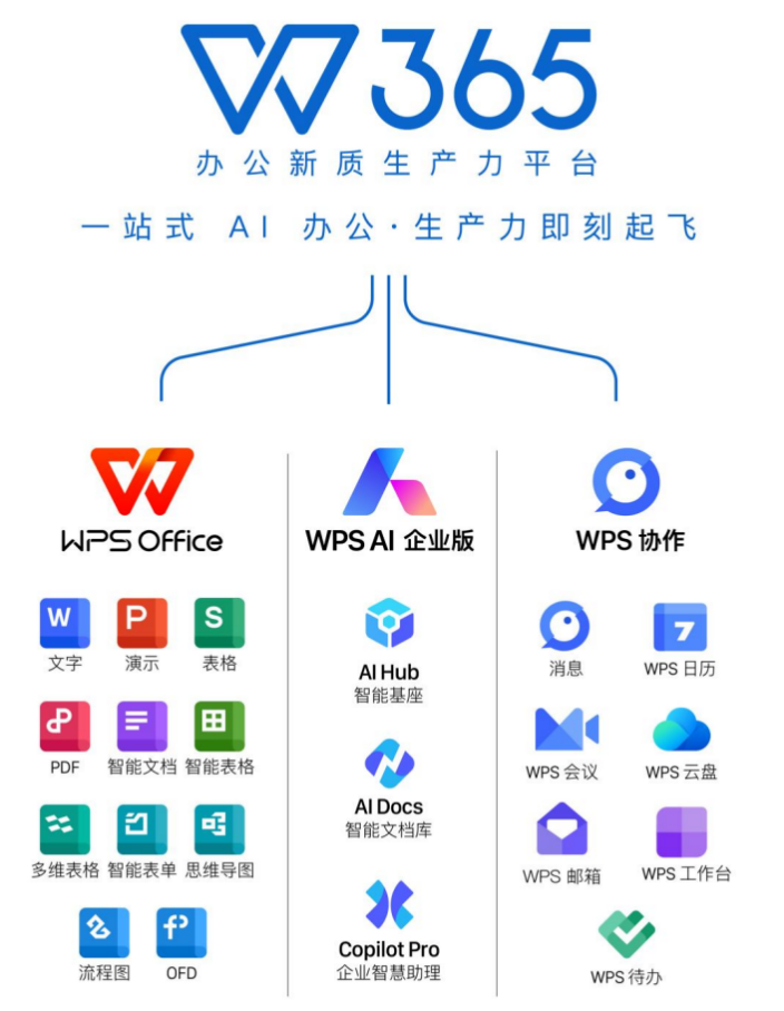 今年4月,金山办公发布了面向组织和企业的办公新质生产力平台WPS 365,全面覆盖了一个组织日常办公的基本需求,从文档创作到即时通讯(IM)、会议、邮件,再到AI应用,标志着一个文档处理套件正式升级为一站式AI办公,让企业生产力即刻起飞。