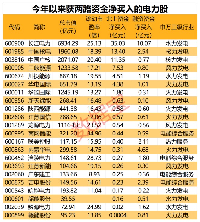 从资金面上来看,融资资金年内净买入长江电力、内蒙华电、中国核电、吉电股份、联美控股等11股均超1亿元;其中分别净买入长江电力10.07亿元、内蒙华电4.68亿元。