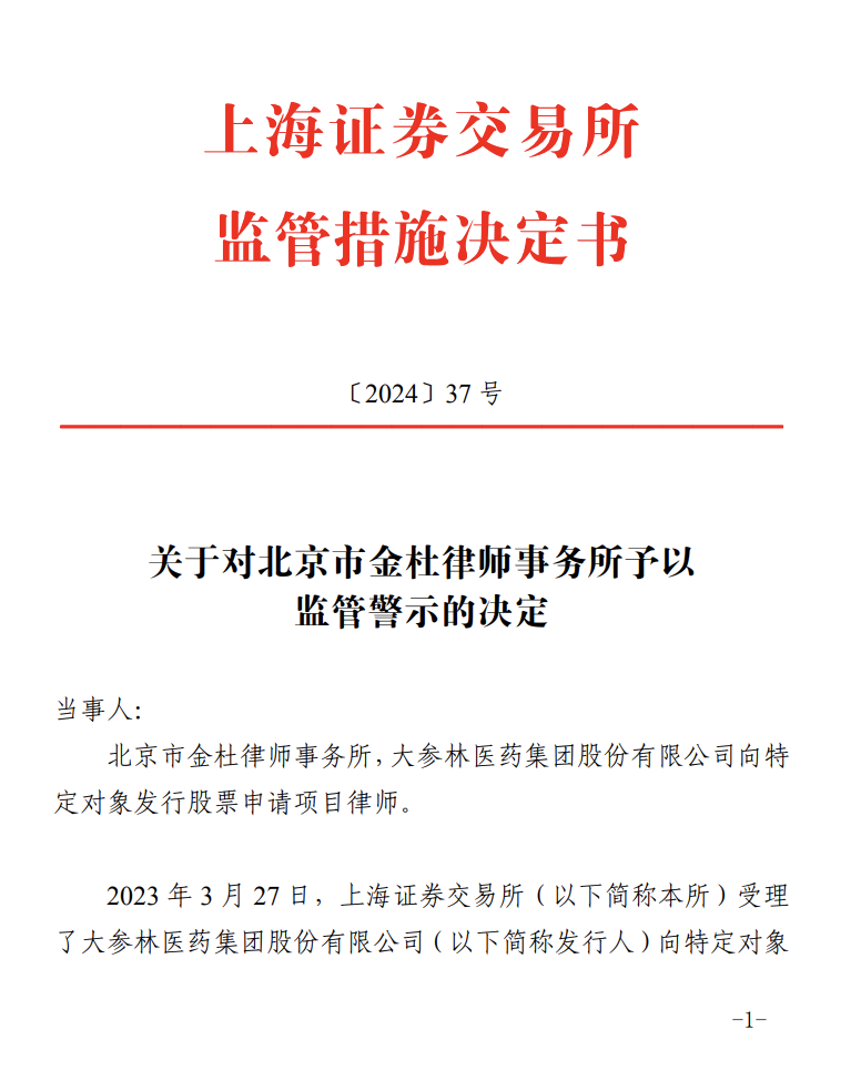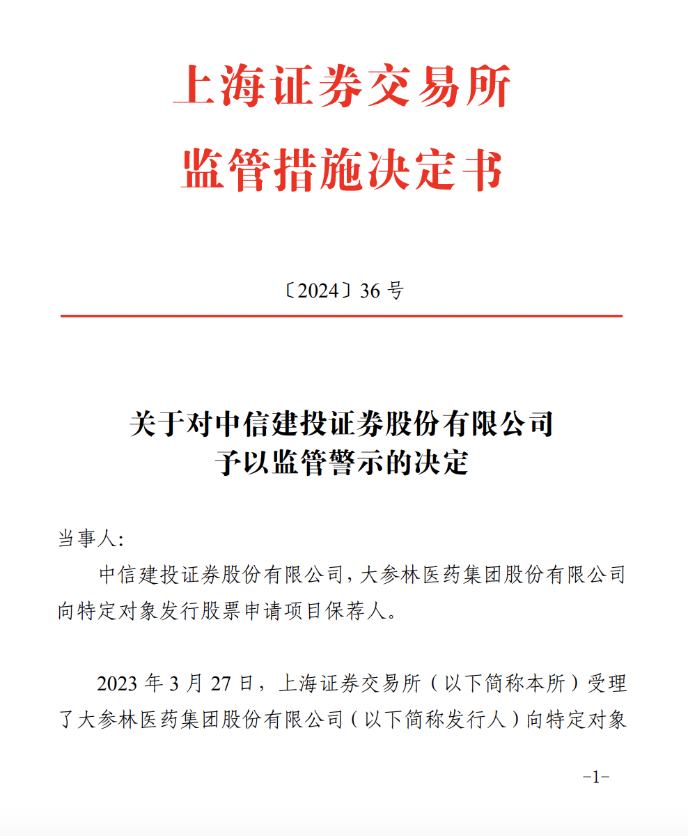 券商又因保荐项目履职不到位被予以监管警示。6月19日,上交所对中信建投证券出具监管措施决定书,系在保荐项目大参林(大参林医药集团股份有限公司)向特定对象发行股票申请过程中,存在履行不到位的情形。
