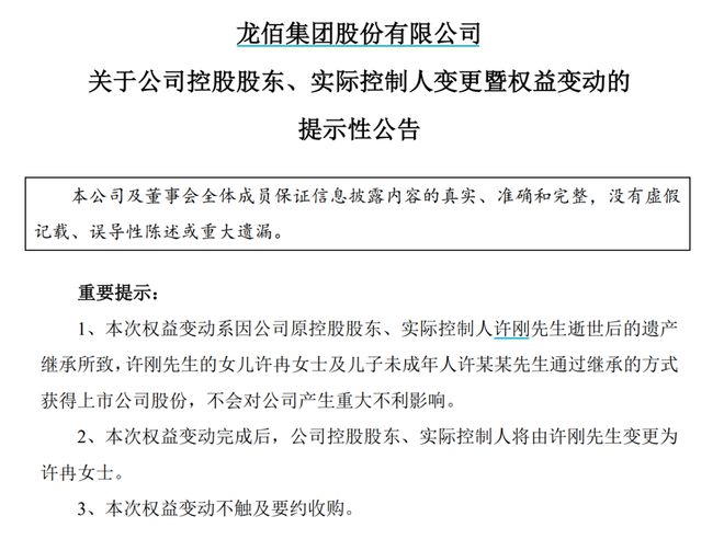 6月20日晚间,上述两家上市公司先后披露实控人变更公告,许刚生前持有的龙佰集团股份,分别由 “90后”的女儿许冉和尚未成年的儿子继承。