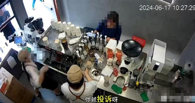 一段咖啡店内的监控视频显示,一名女店员突然情绪失控,冲着一女顾客大喊“你投诉啊”,并将一杯粉状物泼向对方,致使女顾客面部被粉状物糊满。监控视频位置显示为“威海路716号门店”,事发时间为2024年6月17日。