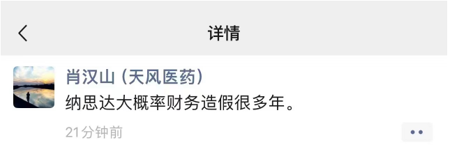 6月20日午间,标注为“天风医药”的肖汉山在其朋友圈直言,纳思达(002180.SZ)大概率财务造假多年。对此言论,之后似乎有另一家券商计算机首席点了赞。